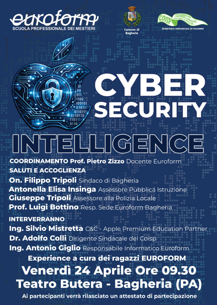 Bagheria si prepara ad accogliere un importante appuntamento dedicato alla sicurezza informatica e all’innovazione tecnologica. Venerdì 24 aprile alle ore 09:30, presso il Teatro Butera, si terrà l’evento “Cyber Security Intelligence”, promosso da Euroform – Scuola Professionale dei Mestieri, in collaborazione con il Comune di Bagheria e il COISP – Segreteria Provinciale di Palermo. Euroform, riconosciuta come Apple Distinguished School, si conferma punto di riferimento nell’ambito della formazione tecnologica avanzata. Grazie a questo prestigioso riconoscimento, l’ente è partner ufficiale di Apple Italia e porta avanti progetti innovativi orientati alle competenze digitali del futuro.